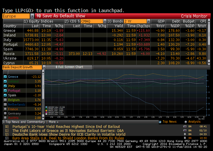 Crisis Monitor allows us to display economic indicators and market data related to financial or political crises in Europe, the Middle East, and the United States, so we can see a broad picture of how the markets in those countries are performing. Crisis Monitor also provides charts for multiple data sets for all the regions, so we can determine trends developing over time.