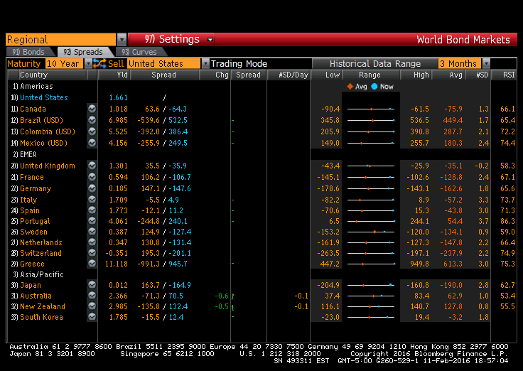 World Bond Markets allows us to monitor and chart sovereign bond yields, spreads, and historical performance on one screen, so we can synthesize the sovereign debt information we need to make quick decisions. Along with current yields and spreads, World Bond Markets displays current rates' statistical deviation from averages, so we can confidently assess yield/spread values and pinpoint anomalies. World Bond Markets is also a gateway to additional world bond market intelligence, offering us a comprehensive view of the sovereign bond market for the individual countries that appear in World Bond Markets.